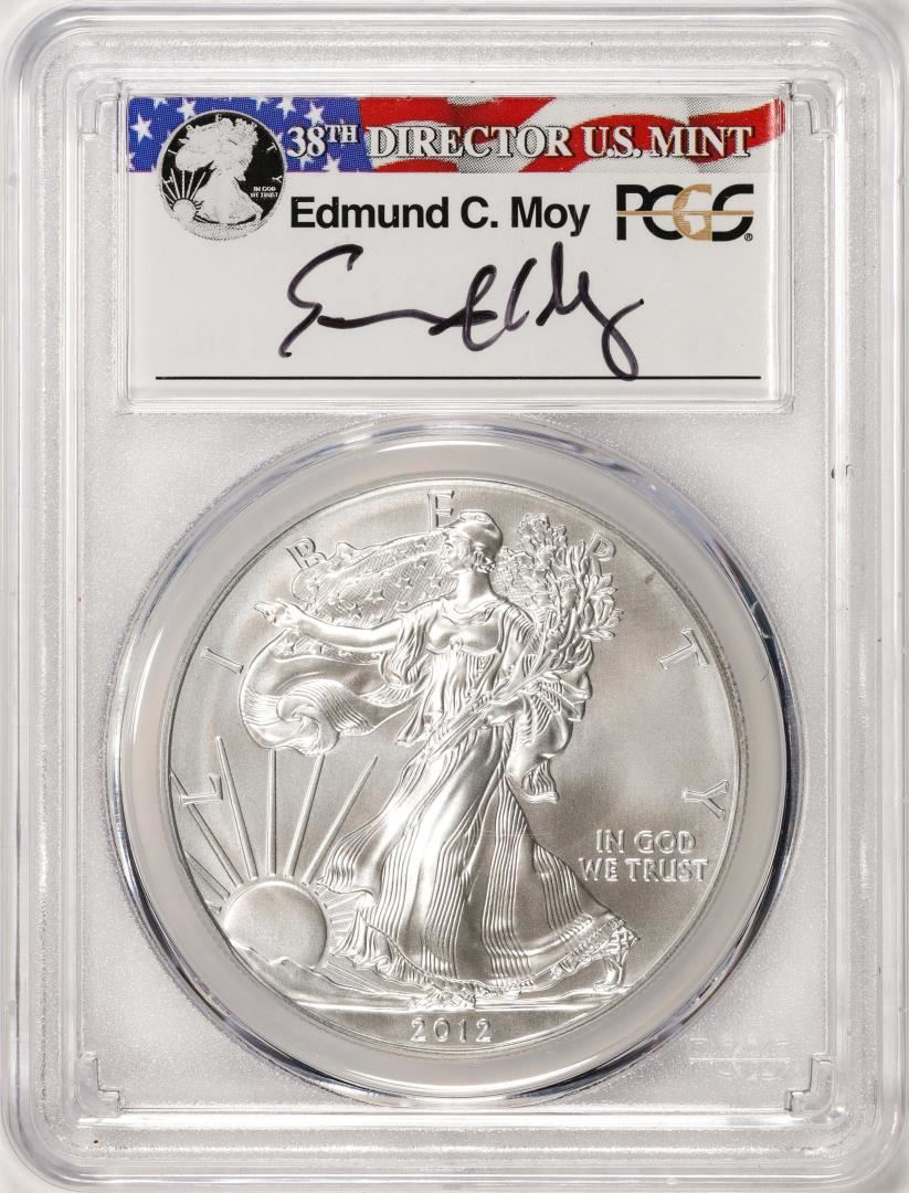 2012-W $1 Burnished American Silver Eagle Coin PCGS SP70 Edmund C. Moy Signature