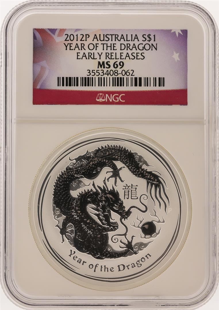 One 2012P $1 Australia Year of the Dragon Silver Coin NGC MS69. NGC Certified.