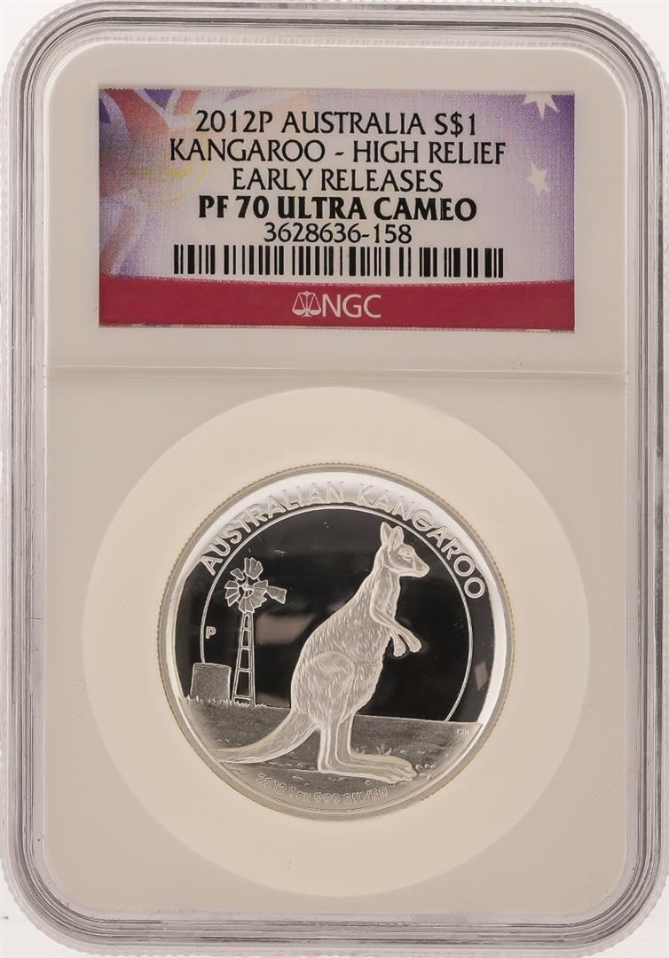 One 2012P $1 Australian Kangaroo Silver Coin High Relief NGC PF70 Ultra Cameo. NGC Certified.