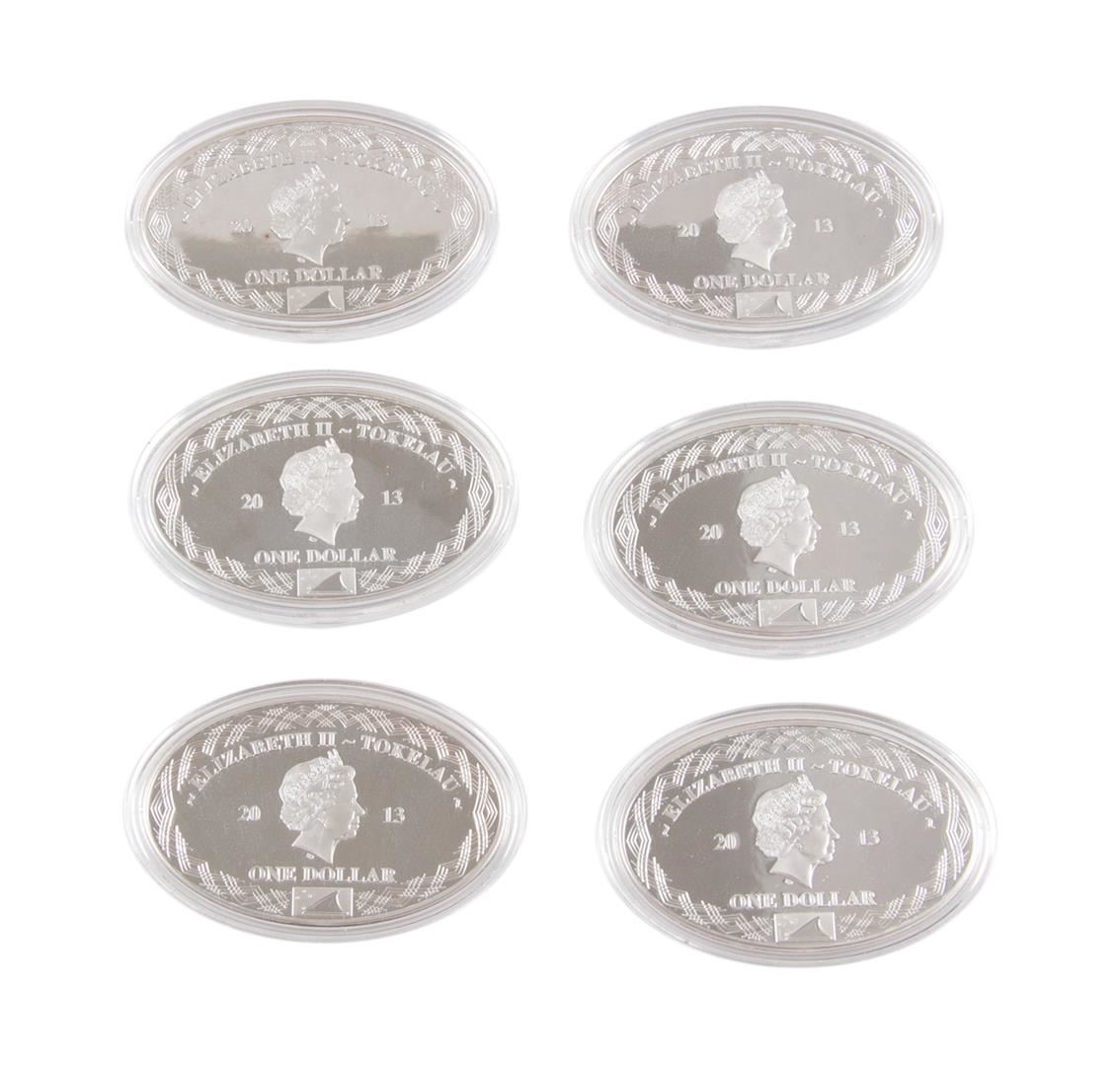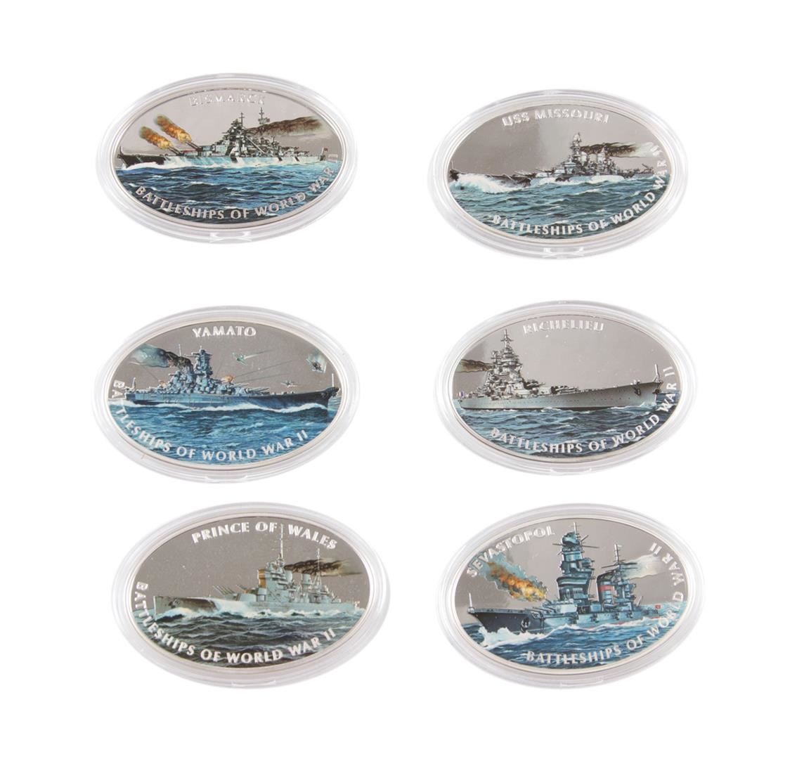 One 2013 $1 Oval Battleships of World War II Proof Clad Coin Set. A set of (6) Coins commemorating the Battleships of World War II which was issued in 2013 by Tokelau with a limited mint of only 3,000 sets being issued.