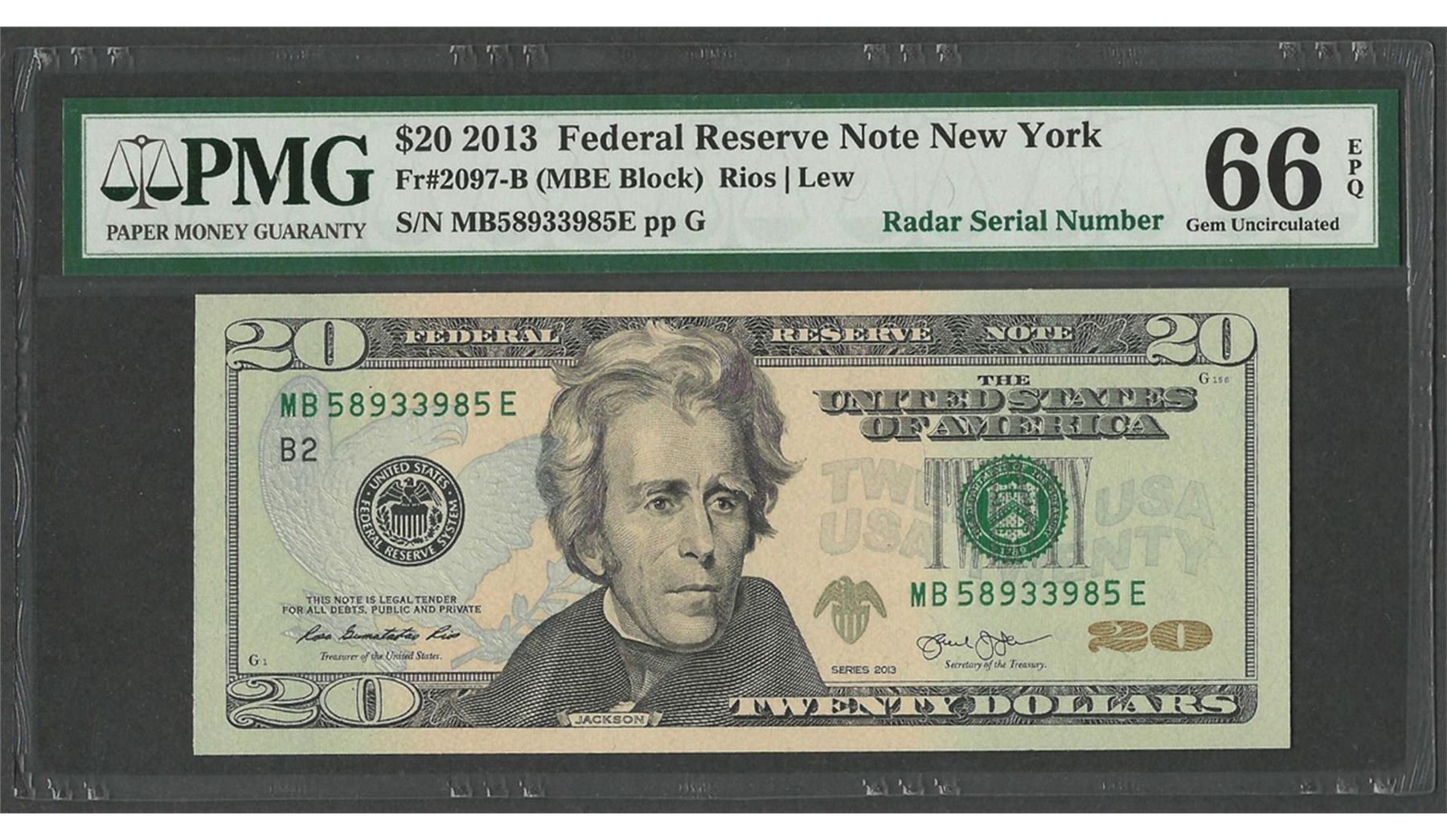 2013 $20 Federal Reserve Note New York Radar Serial Number PMG Gem Uncirculated 66EPQ