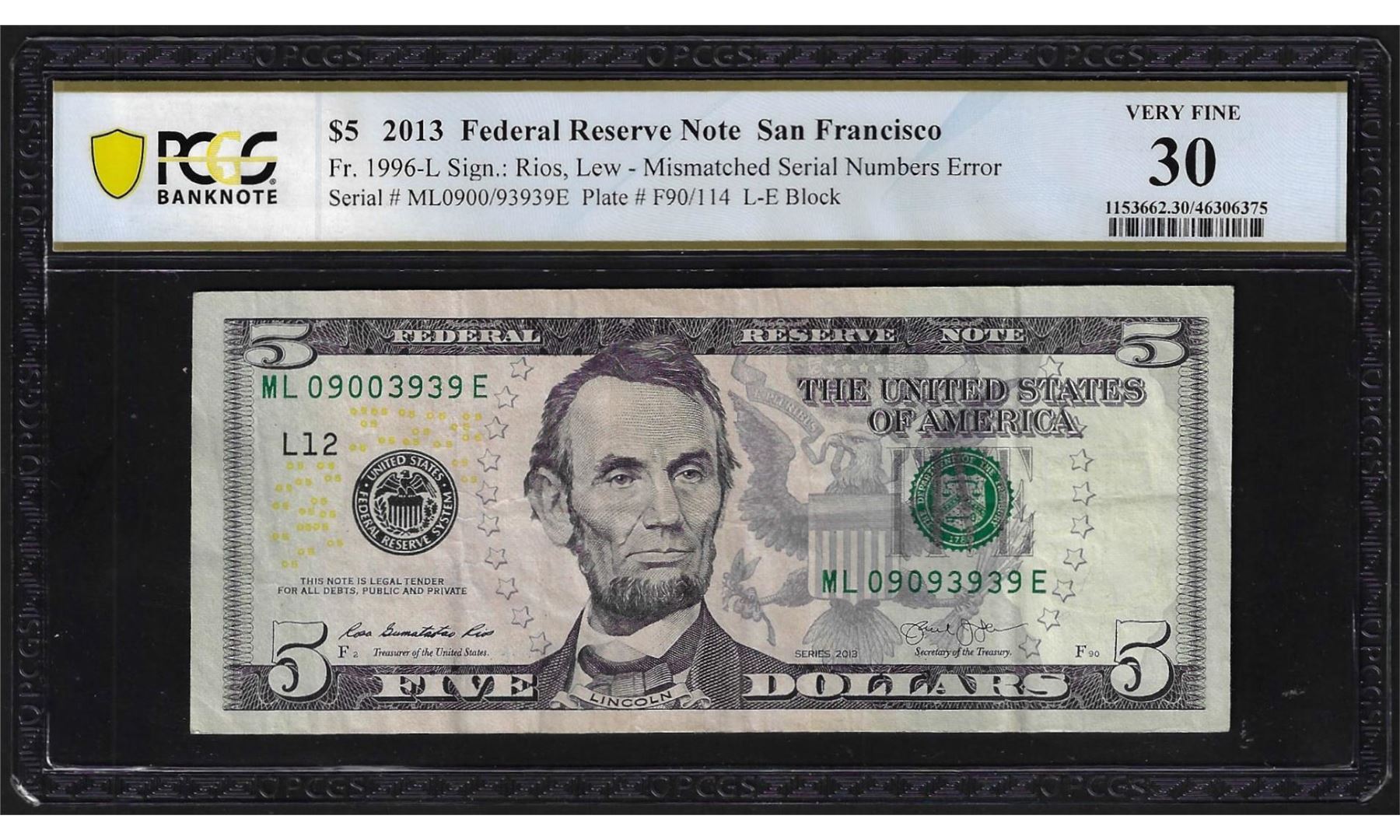 One 2013 $5 Federal Reserve Note Mismatched Serial Number Error Fr.1996-L PCGS Very Fine 30. PCGS Graded.