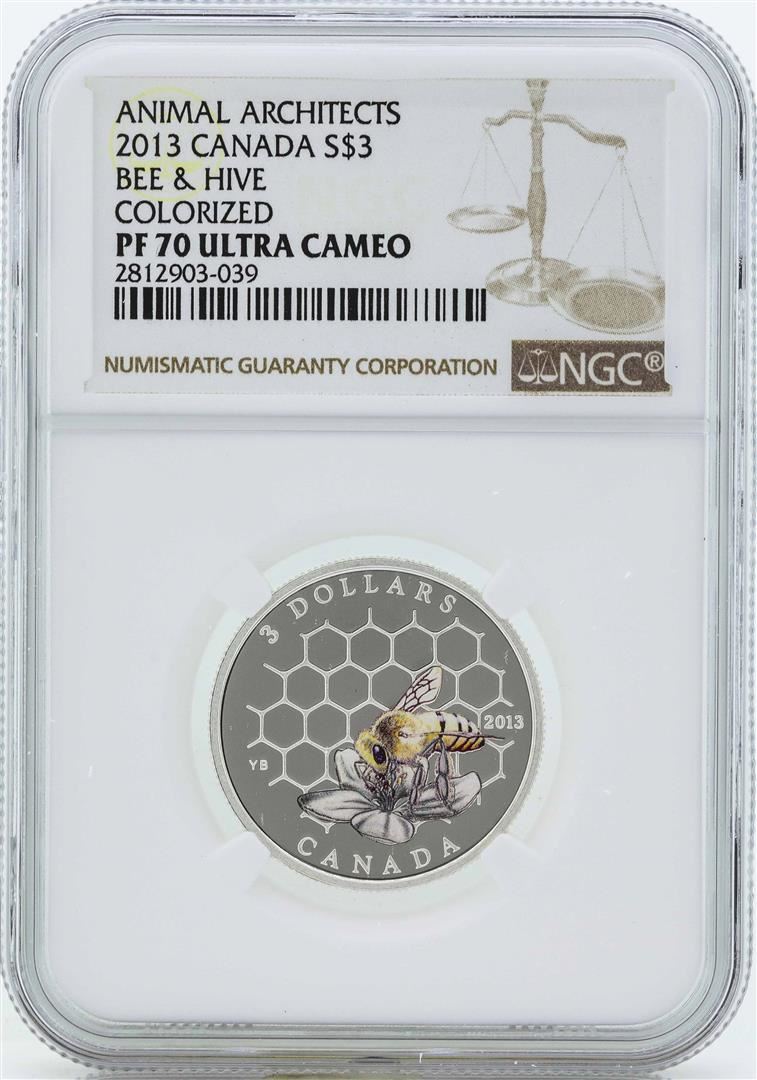One 2013 Canada $3 Bee & Hive Colorized Silver Coin PF70 Ultra Cameo.