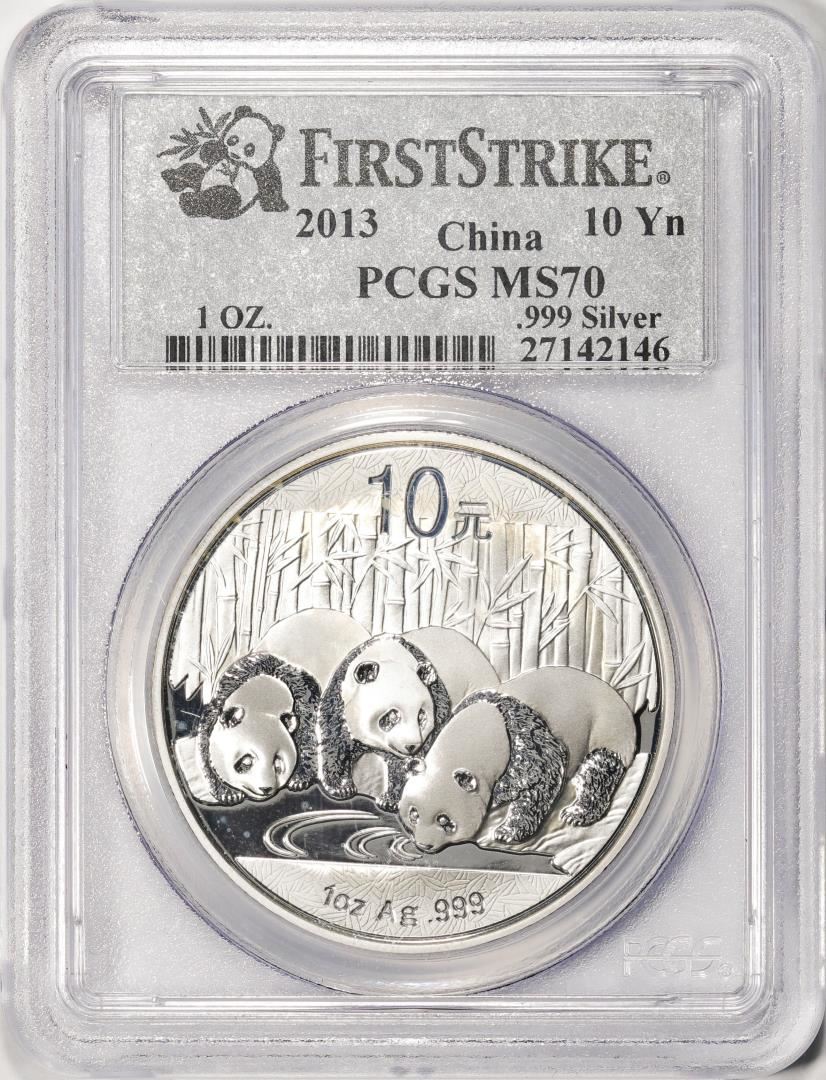 One 2013 China 10 Yuan Silver Panda Coin PCGS MS70 First Strike. PCGS Graded.