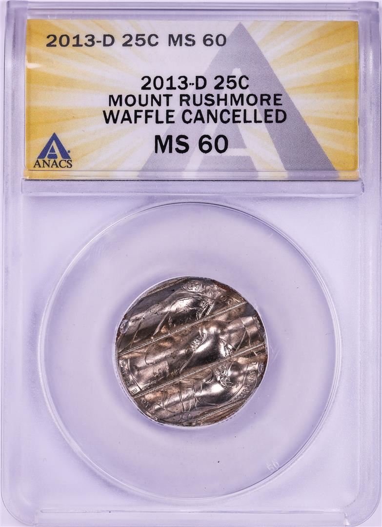 One 2013-D Mount Rushmore ATB Quarter Waffle Cancelled Coin ANACS MS60. ANACS Certified.