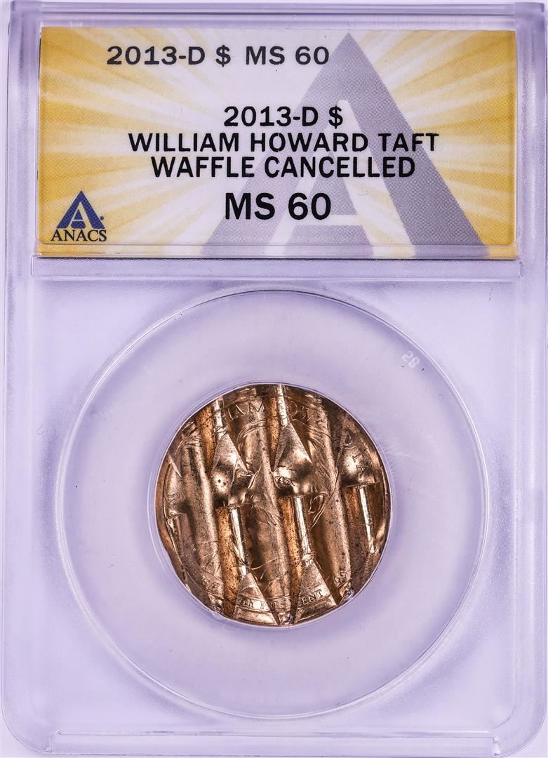 One 2013-D William Howard Presidential Dollar Waffle Cancelled Coin ANACS MS60. ANACS Certified.