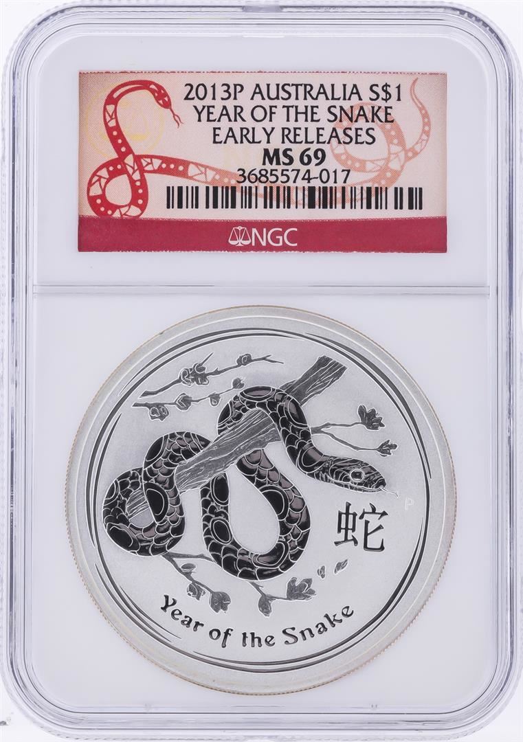 One 2013-P $1 Australia Year of the Snake Silver Coin NGC MS69. NGC Certified.