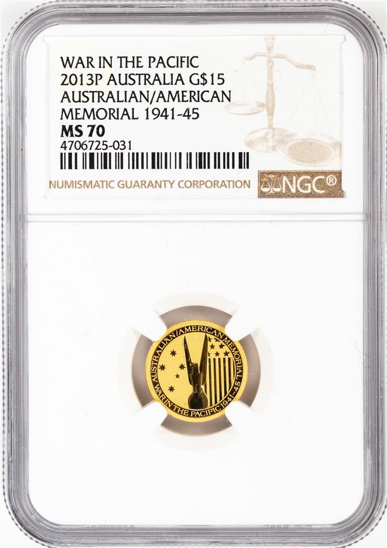 One 2013-P $15 Australia War in the Pacific Memorial Gold Coin NGC MS70. NGC Certified.