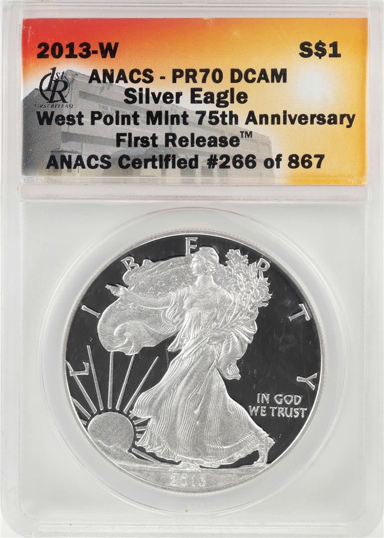 One 2013-W $1 Proof American Silver Eagle Coin ANACS PR70 DCAM First Release. ANACS Certified.