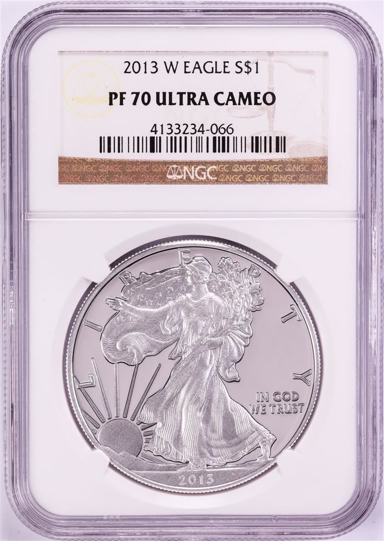 One 2013-W $1 Proof American Silver Eagle Coin NGC PF70 Ultra Cameo. NGC Certified.