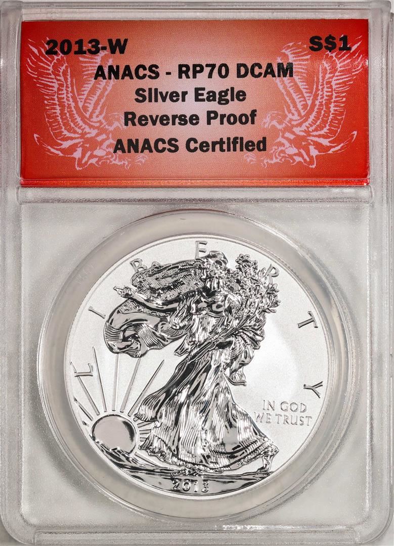 One 2013-W $1 Reverse Proof American Silver Eagle Coin ANACS RP70 DCAM. ANACS Certified.