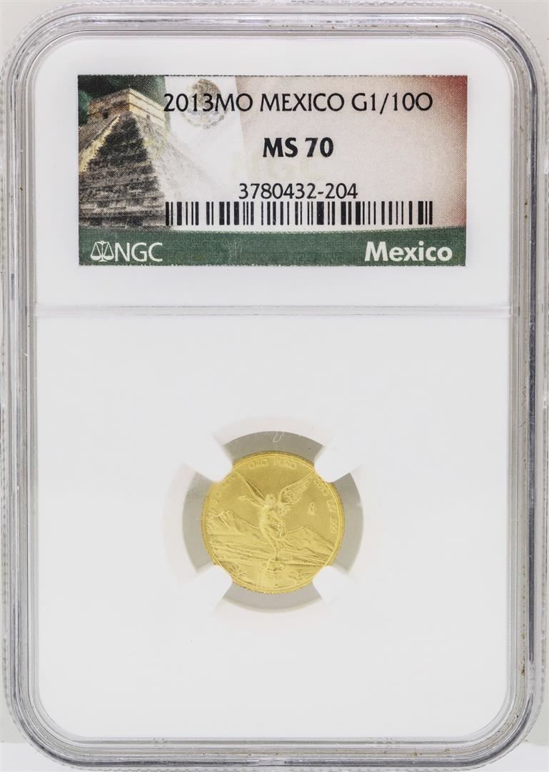 One 2013MO Mexico 1/10 oz. Mexico Libertad Gold Coin NGC MS70. NGC Certified.