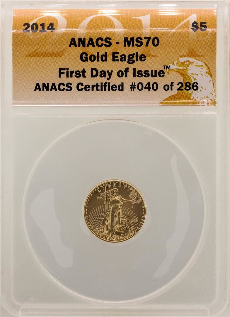 One 2014 $5 American Gold Eagle ANACS MS70 First Day of Issue. ANACS Certified.