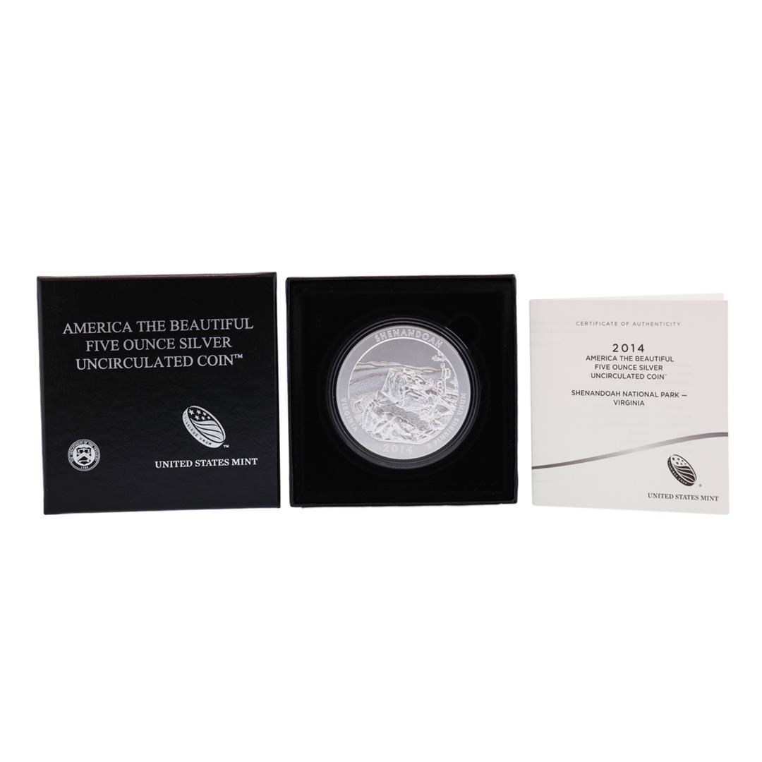 One 2014 5oz Silver ATB Great Shenandoah Virginia Silver Proof Coin w/box.