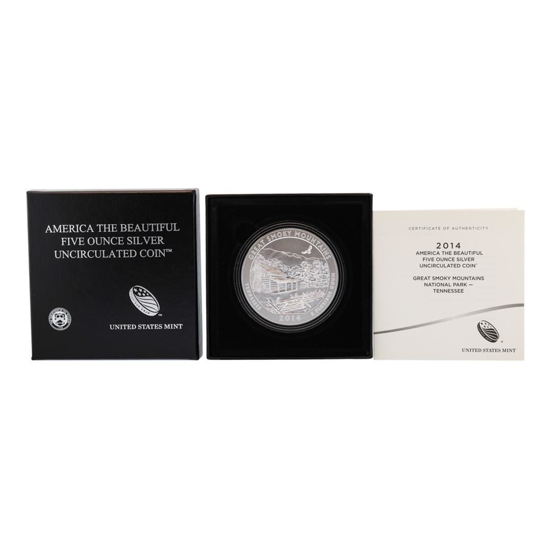 One 2014 5oz Silver ATB Great Smokey Mountain Tennessee Silver Proof Coin w/box.