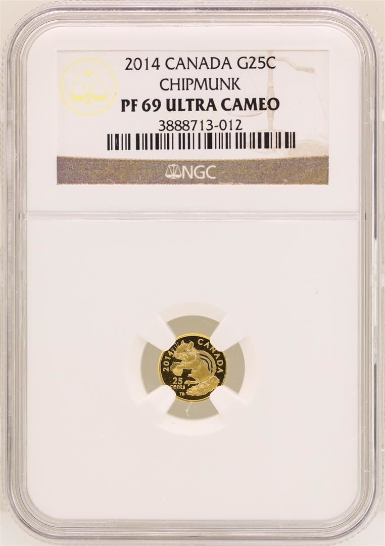 One 2014 Canada 25 Cents Gold Chipmunk Coin NGC PF69 Ultra Cameo. NGC Certified.