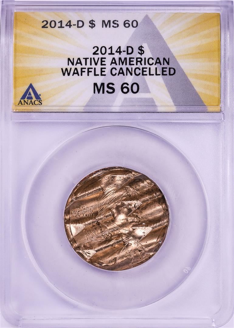 One 2014-D Native American Dollar Waffle Cancelled Coin ANACS MS60. ANACS Certified.