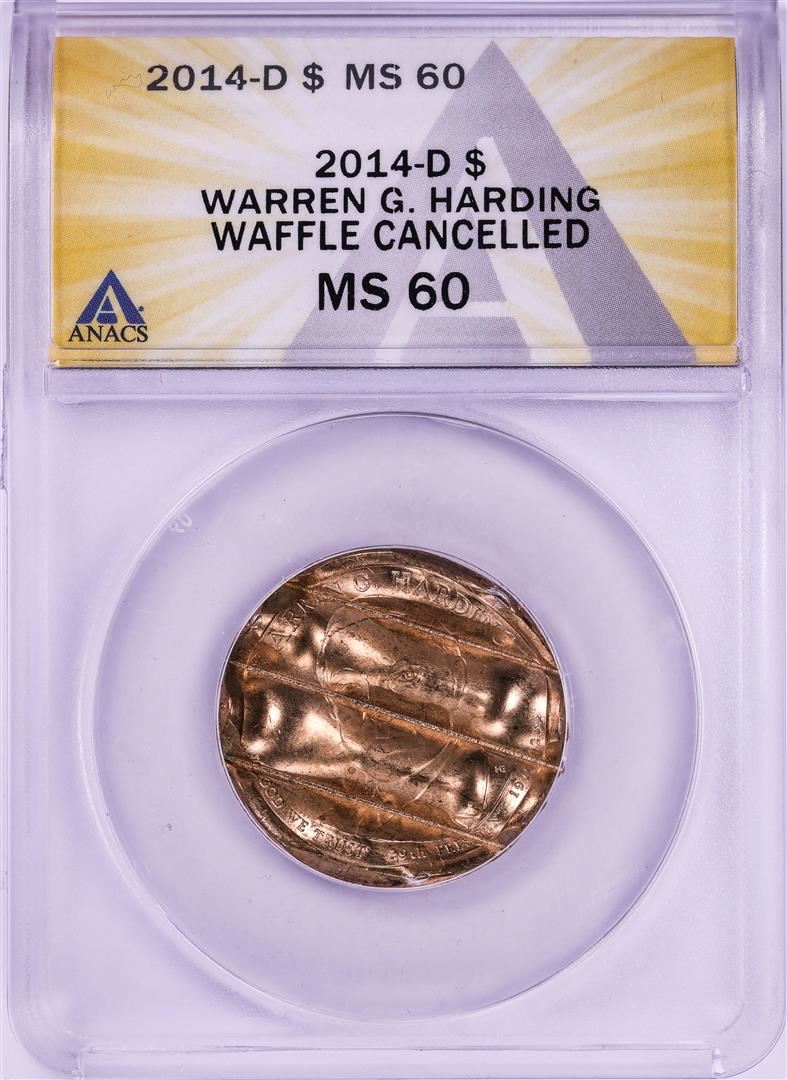 One 2014-D Warren G. Harding Presidential Dollar Waffle Cancelled Coin ANACS MS60. ANACS Certified.