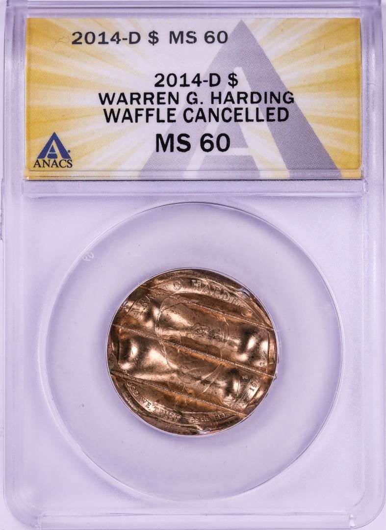 One 2014-D Warren G. Harding Presidential Dollar Waffle Cancelled Coin ANACS MS60. ANACS Certified.
