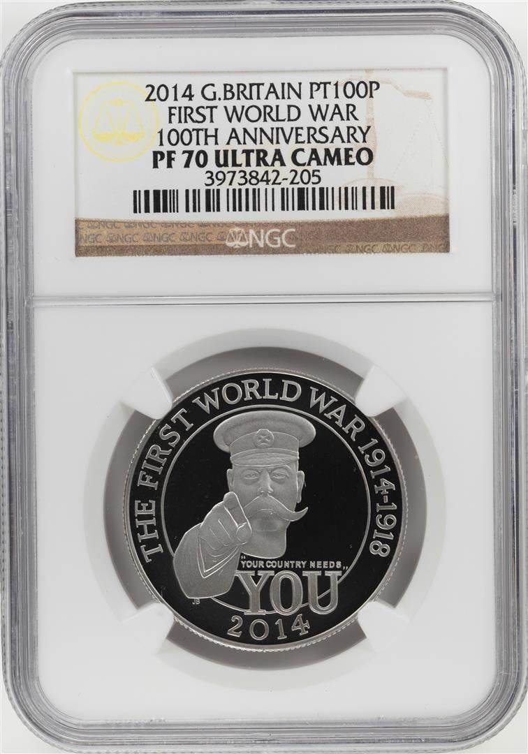 One 2014 Great Britain 100 Pounds First World War Platinum Coin NGC PF70 Ultra Cameo. NGC Certified.