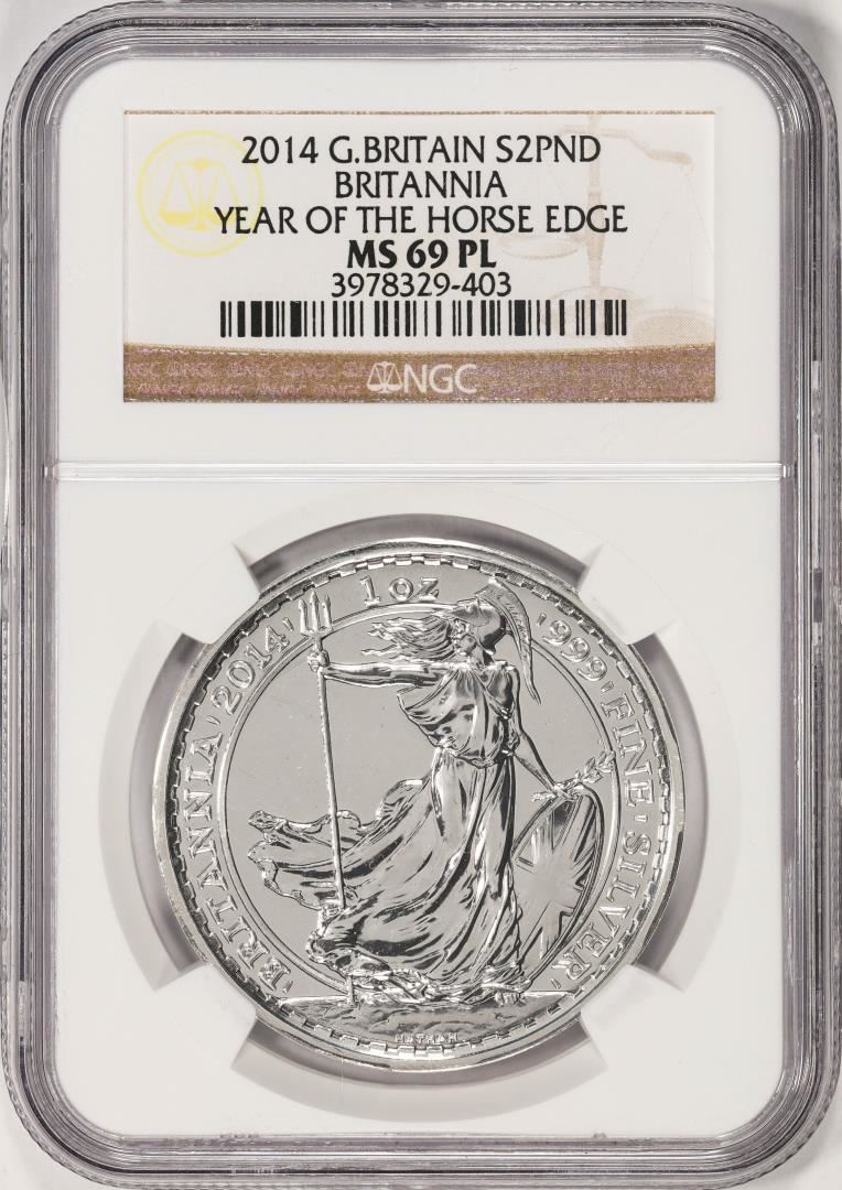 One 2014 Great Britain 2 Pounds Britannia Year of the Horse Silver Coin NGC MS69PL. NGC Certified.