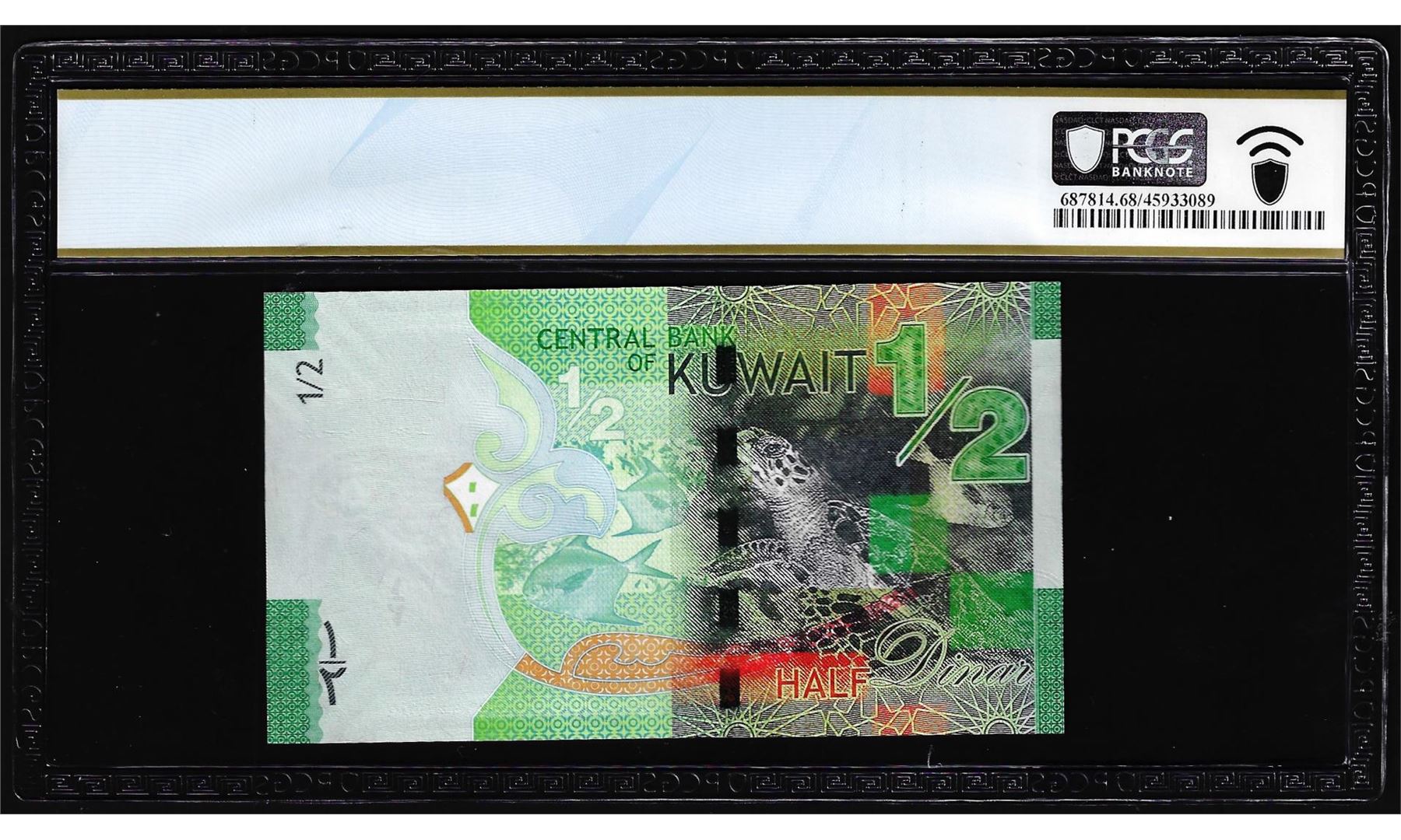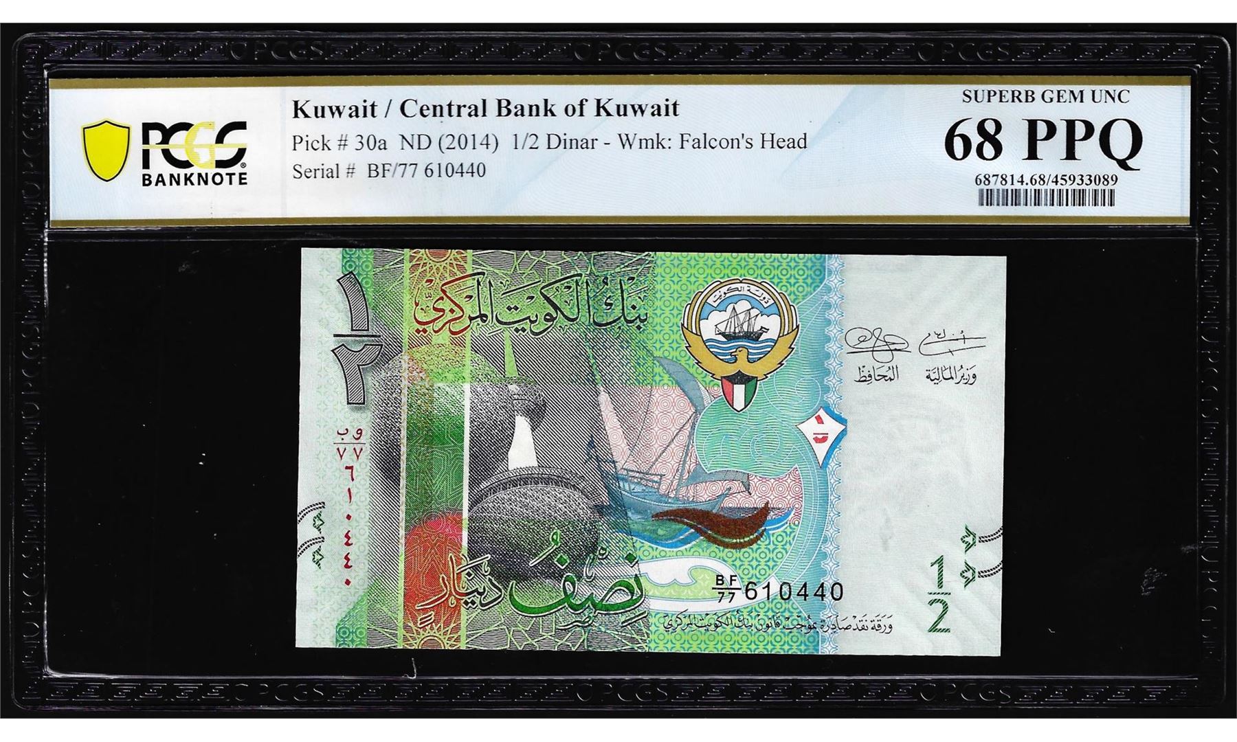 One 2014 Kuwait 1/2 Dinar Note Pick# 30a PCGS Superb Gem Uncirculated 68PPQ. PCGS Graded.