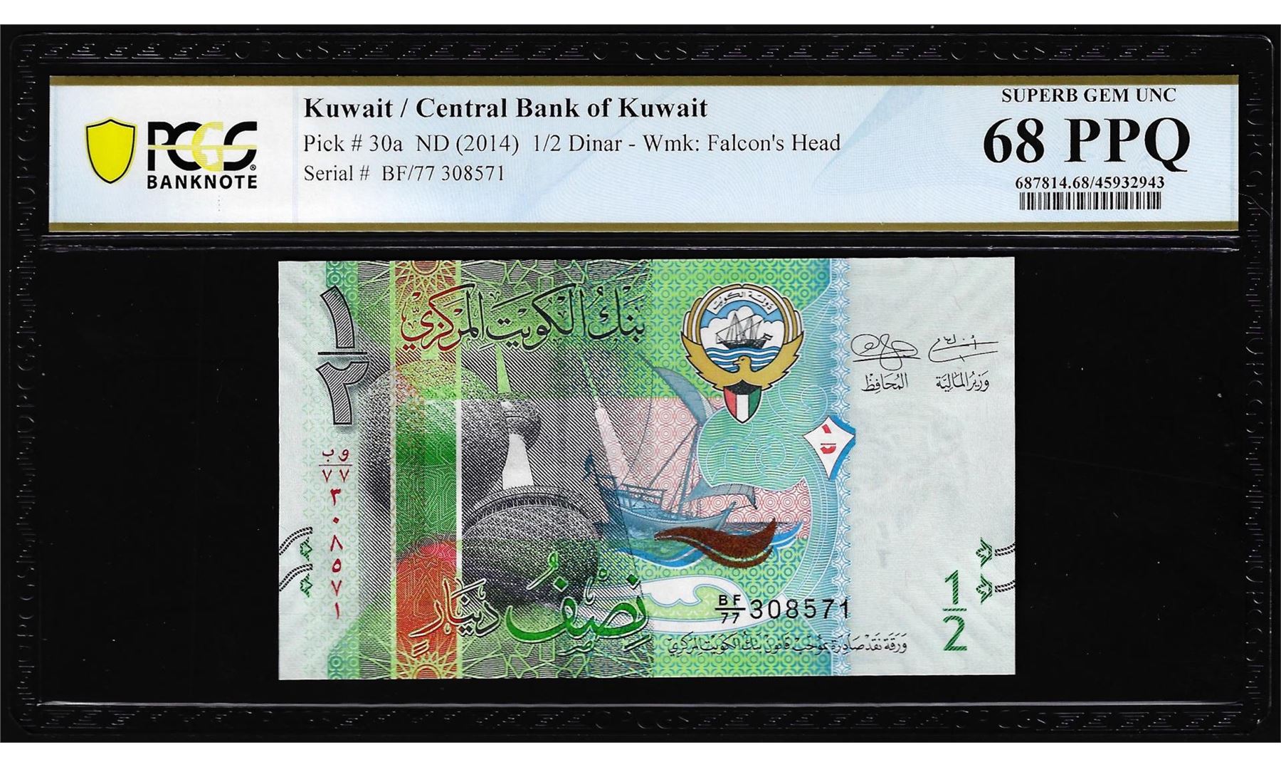 One 2014 Kuwait 1/2 Dinar Note Pick# 30a PCGS Superb Gem Uncirculated 68PPQ. PCGS Graded.
