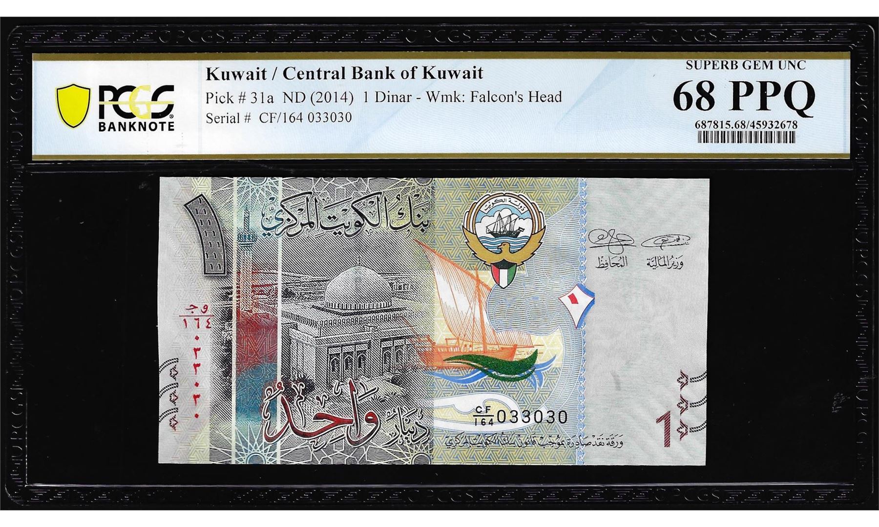 One 2014 Kuwait 1 Dinar Note Pick# 31a PCGS Superb Gem Uncirculated 68PPQ. PCGS Graded.