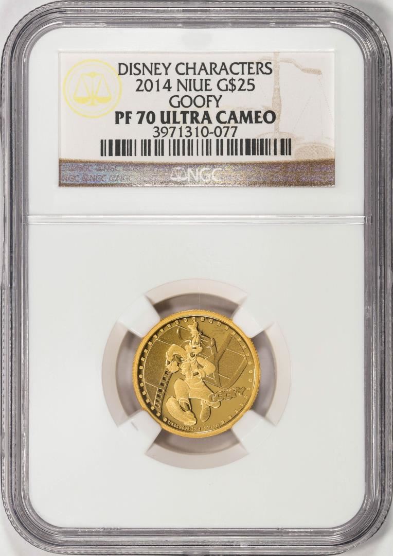 One 2014 Niue $25 Proof Disney Characters Goofy Gold Coin NGC PF70 Ultra Cameo W/ COA. NGC Certified.