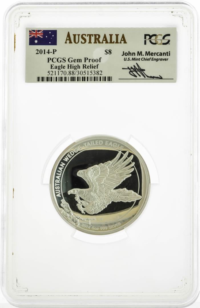 One 2014-P Australia $8 Proof Eagle High Relief Silver Coin PCGS Gem Proof Mercanti Signed. PCGS Graded.