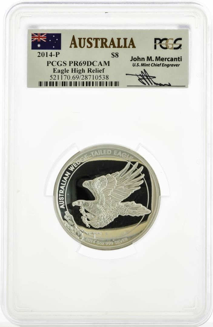 One 2014-P Australia $8 Proof Eagle High Relief Silver Coin PCGS PR69DCAM Mercanti Signed. PCGS Graded.