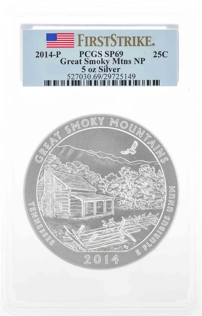One 2014-P Quarter Great Smoky Mountains America the Beautful 5 oz. First Strike PCGS SP69. PCGS Graded.