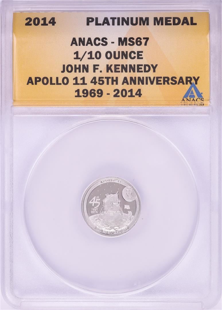 One 2014 Proof 1/10 oz Platinum JFK Apollo 11 Anniversary Medal ANACS MS67. ANACS Certified.