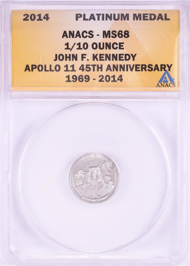 One 2014 Proof 1/10 oz Platinum JFK Apollo 11 Anniversary Medal ANACS MS68. ANACS Certified.