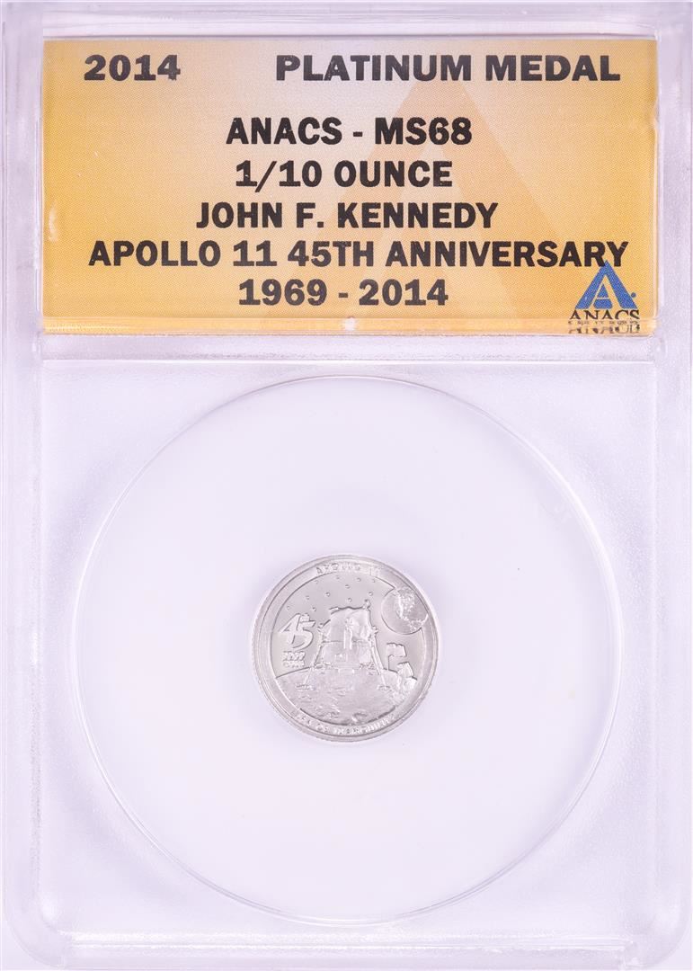 One 2014 Proof 1/10 oz Platinum JFK Apollo 11 Anniversary Medal ANACS MS68. ANACS Certified.