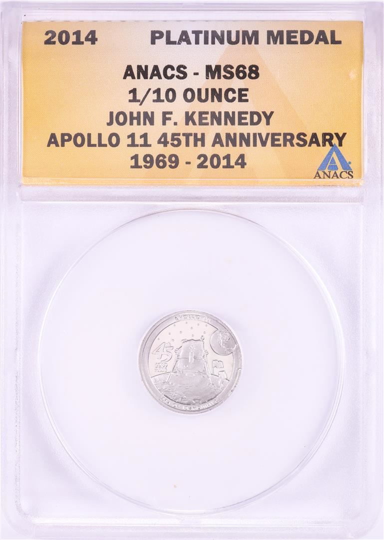 One 2014 Proof 1/10 oz Platinum JFK Apollo 11 Anniversary Medal ANACS MS68. ANACS Certified.