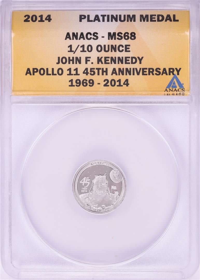 One 2014 Proof 1/10 oz Platinum JFK Apollo 11 Anniversary Medal ANACS MS68. ANACS Certified.