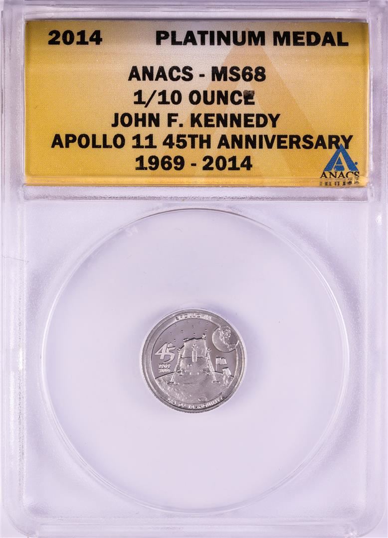 One 2014 Proof 1/10 oz Platinum JFK Apollo 11 Anniversary Medal ANACS MS68. ANACS Certified.