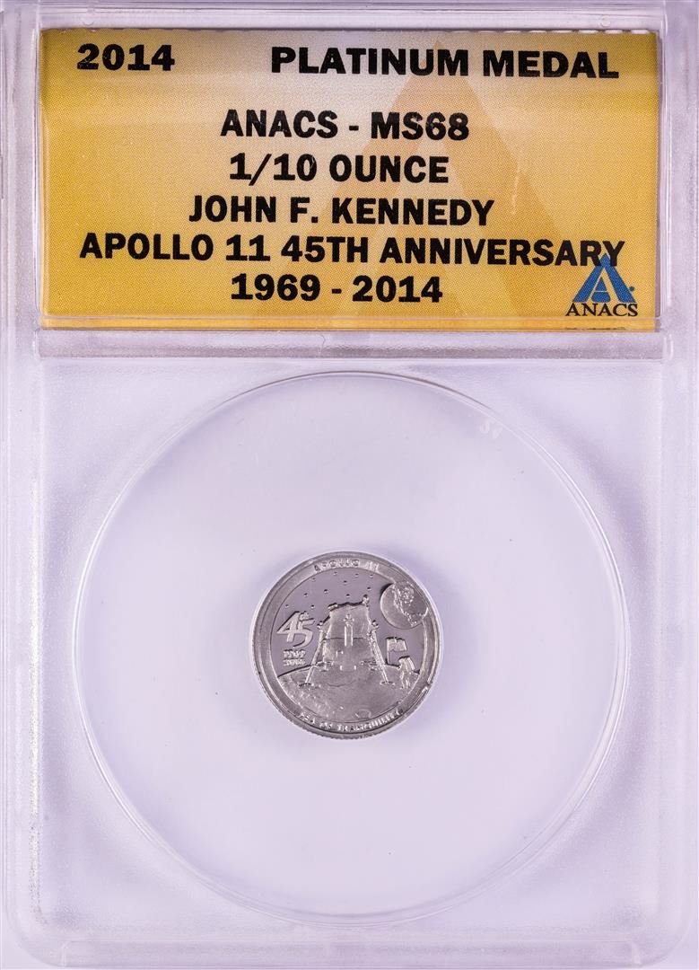 One 2014 Proof 1/10 oz Platinum JFK Apollo 11 Anniversary Medal ANACS MS68. ANACS Certified.