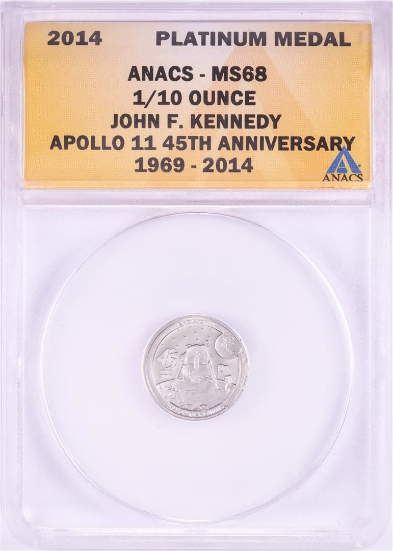 One 2014 Proof 1/10 oz Platinum JFK Apollo 11 Anniversary Medal ANACS MS68. ANACS Certified.
