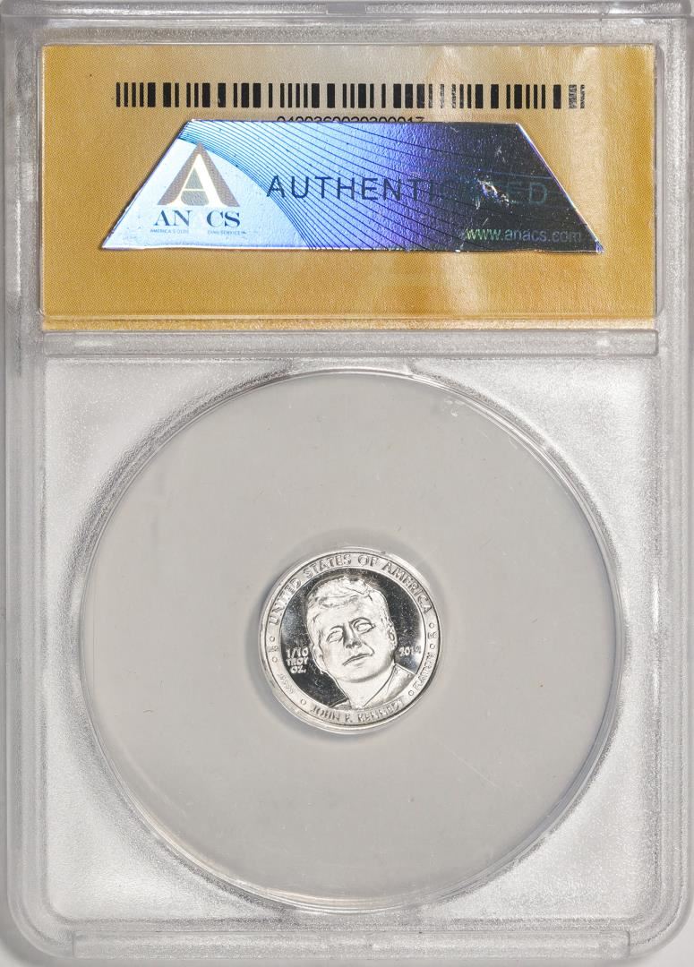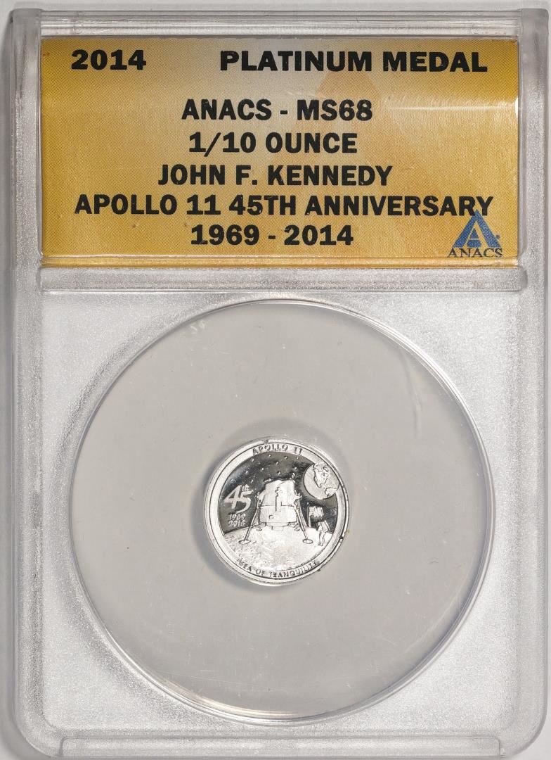 One 2014 Proof 1/10 oz Platinum JFK Apollo 11 Anniversary Medal ANACS MS68. ANACS Certified.