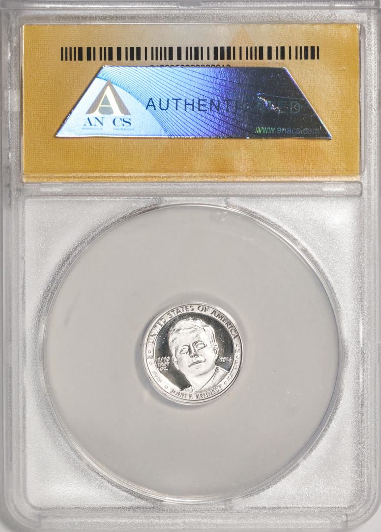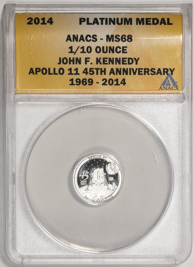 One 2014 Proof 1/10 oz Platinum JFK Apollo 11 Anniversary Medal ANACS MS68. ANACS Certified.