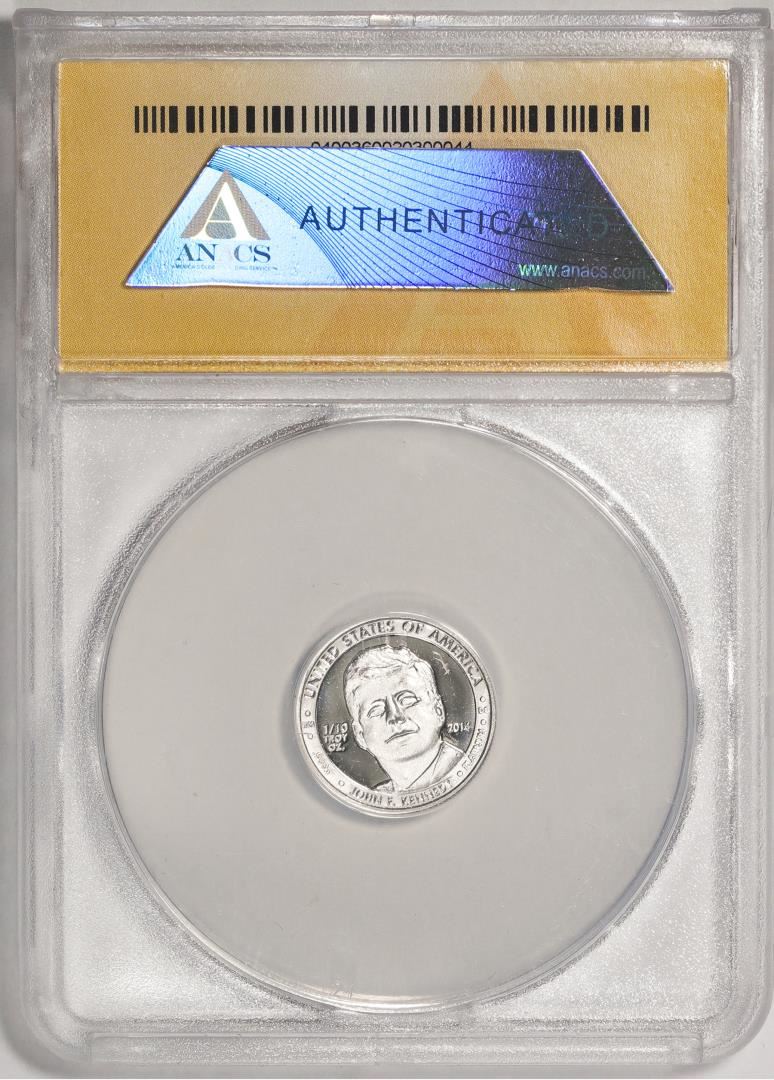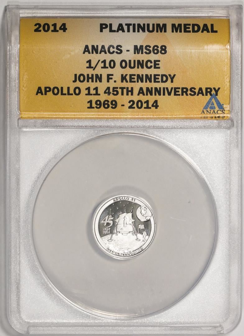 One 2014 Proof 1/10 oz Platinum JFK Apollo 11 Anniversary Medal ANACS MS68. ANACS Certified.
