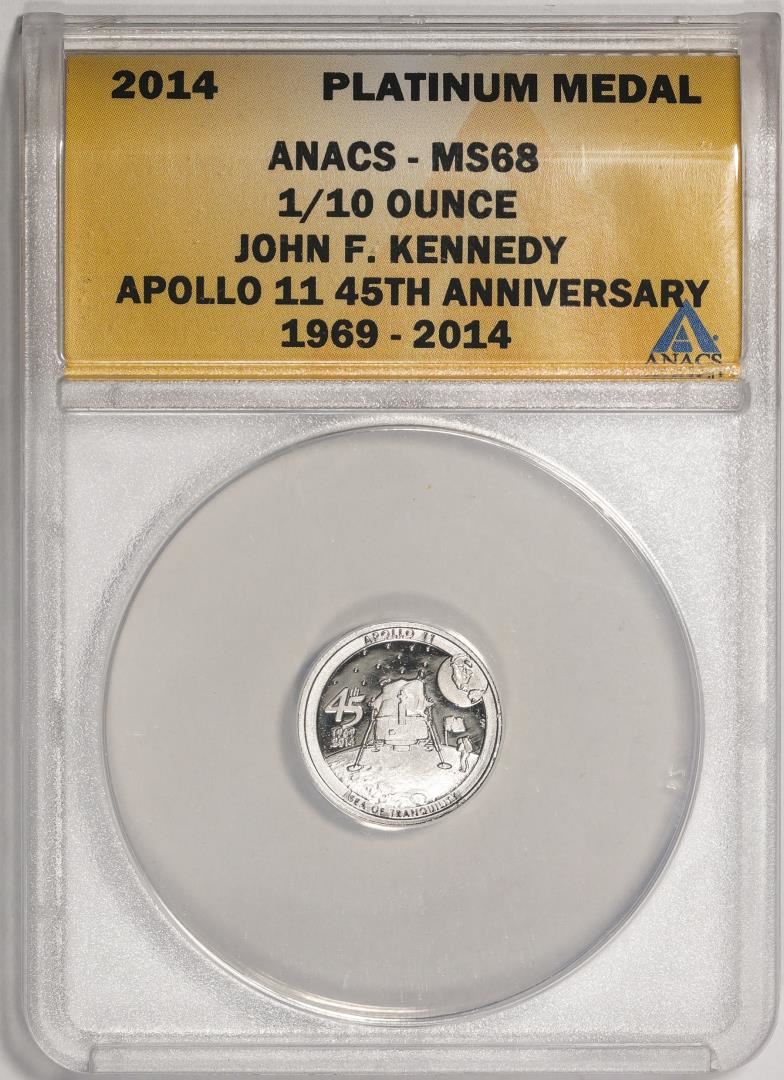 One 2014 Proof 1/10 oz Platinum JFK Apollo 11 Anniversary Medal ANACS MS68. ANACS Certified.