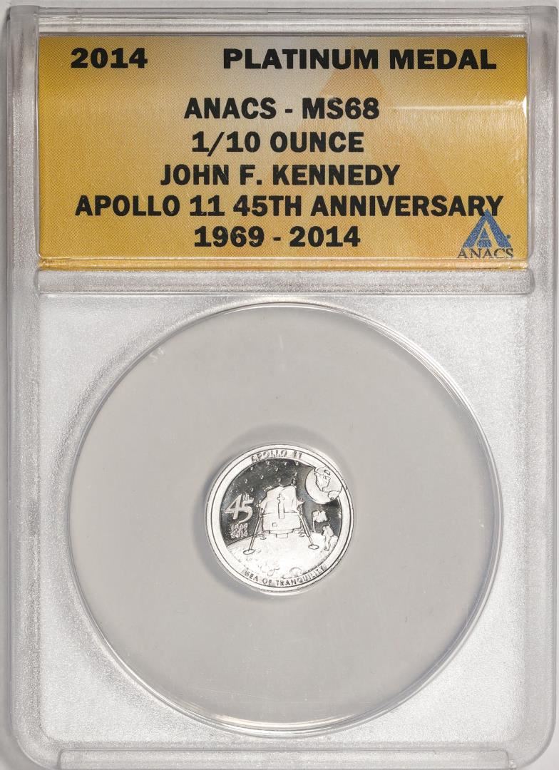 One 2014 Proof 1/10 oz Platinum JFK Apollo 11 Anniversary Medal ANACS MS68. ANACS Certified.