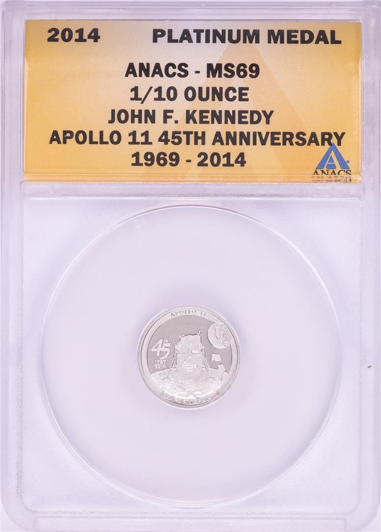 One 2014 Proof 1/10 oz Platinum JFK Apollo 11 Anniversary Medal ANACS MS69. ANACS Certified.