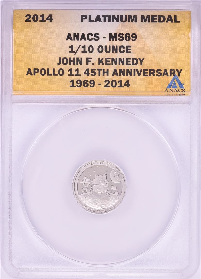 One 2014 Proof 1/10 oz Platinum JFK Apollo 11 Anniversary Medal ANACS MS69. ANACS Certified.