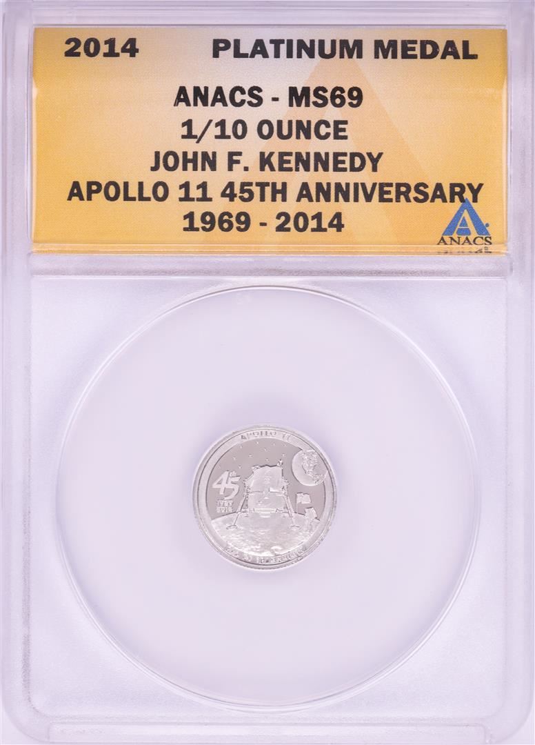 One 2014 Proof 1/10 oz Platinum JFK Apollo 11 Anniversary Medal ANACS MS69. ANACS Certified.