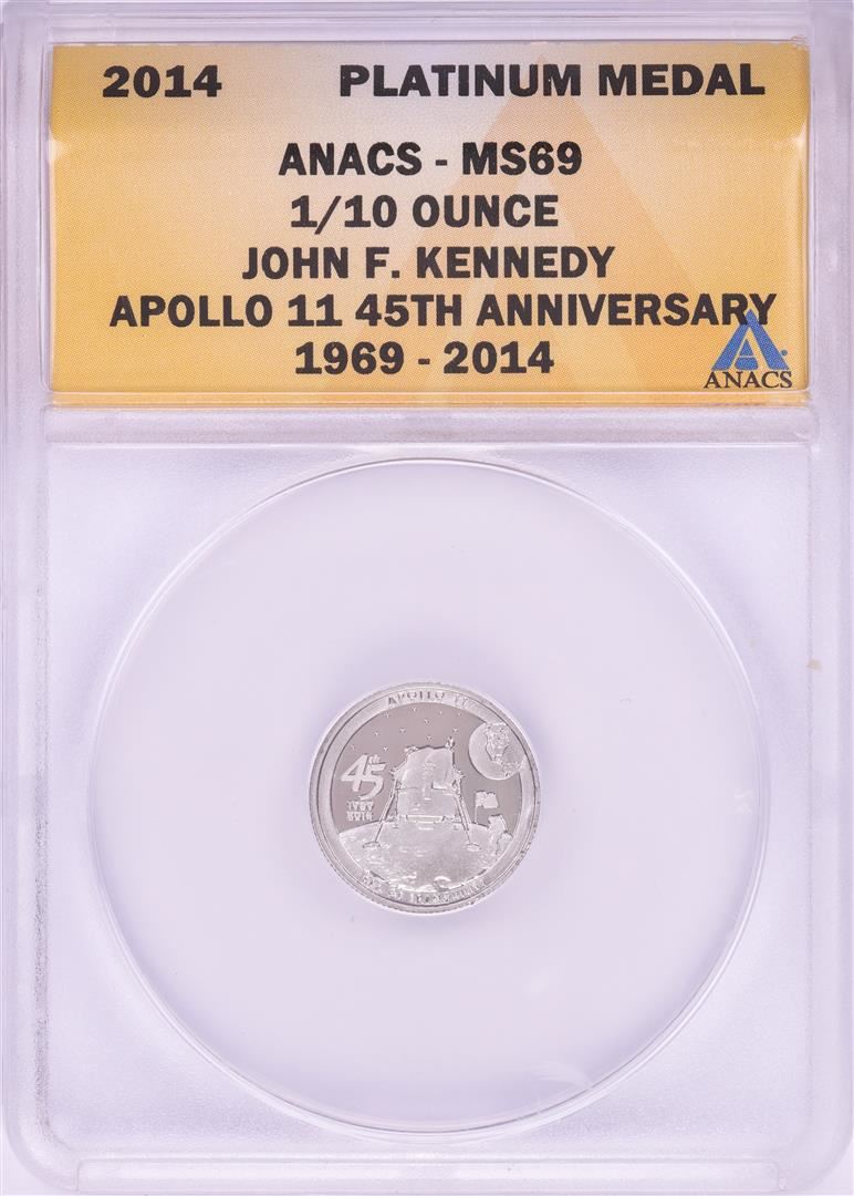 One 2014 Proof 1/10 oz Platinum JFK Apollo 11 Anniversary Medal ANACS MS69. ANACS Certified.