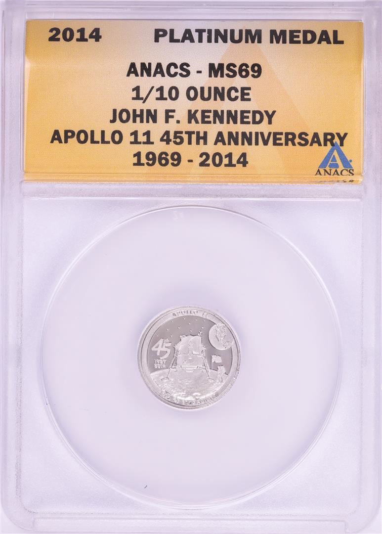 One 2014 Proof 1/10 oz Platinum JFK Apollo 11 Anniversary Medal ANACS MS69. ANACS Certified.